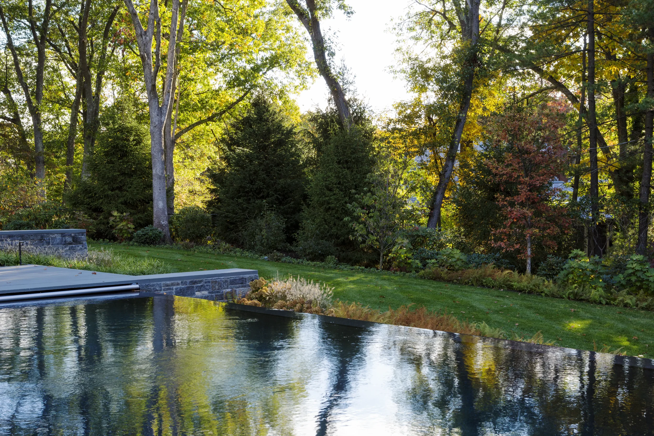 Renovations to this historic estate include a new outdoor living pavilion adjacent an infinity edge pool; multiple patio spaces; new driveway and front door drop off; and an abundance of lush fountain and buffer planting. The design incorporates existing mature trees and a retaining wall to make the improvements appear seamless.