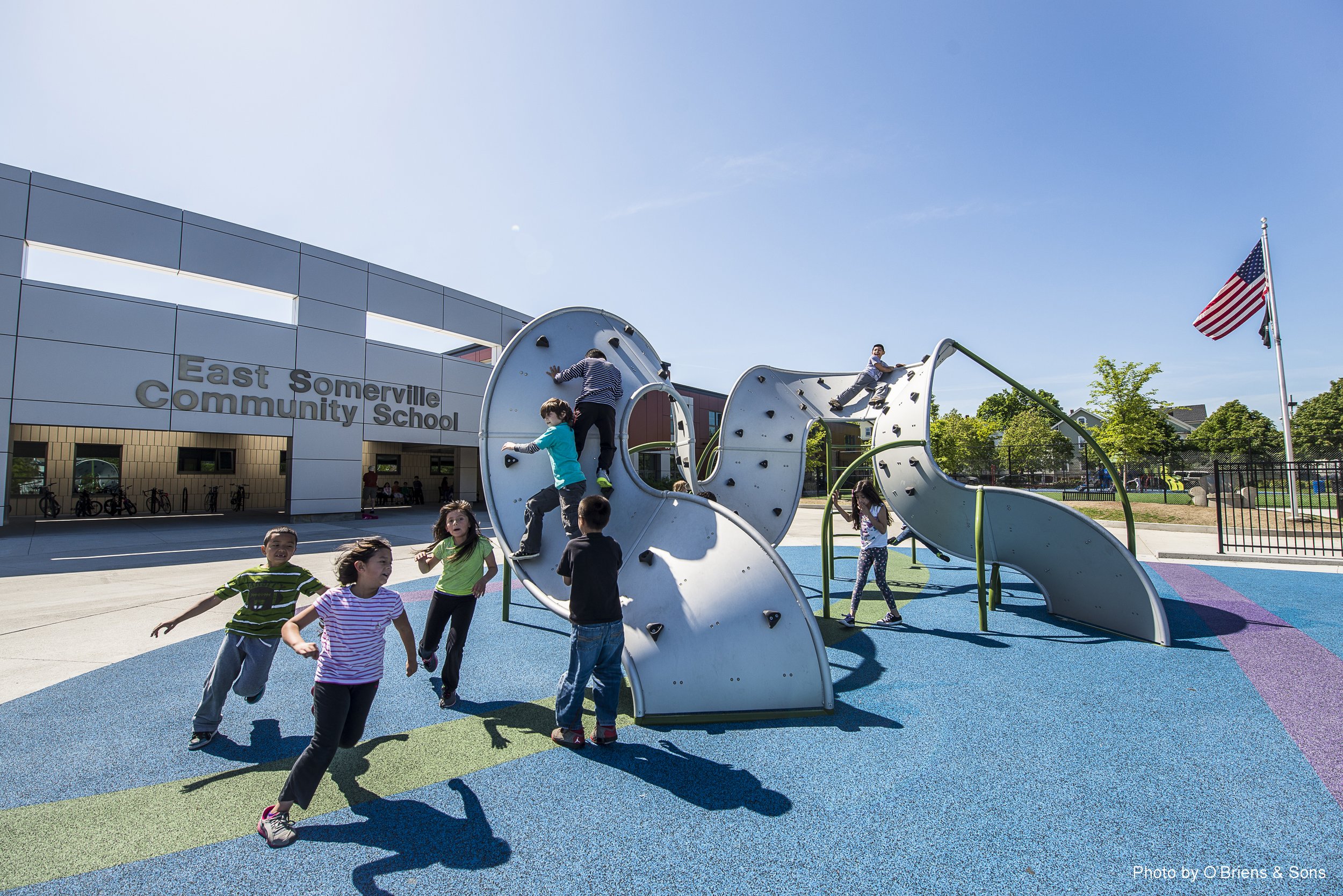 Designed as a true extension of the school’s educational mission, the landscape at East Somerville Community School creates a network of purposeful outdoor spaces that support learning, play, and community connection within a dense urban setting. A series of courtyards and play areas offer distinct yet interconnected experiences: a library courtyard features a gently sculpted artificial turf mound that invites reading, gathering, and quiet reflection; a learning garden courtyard provides hands-on opportunities for students to grow food and engage with ecological systems; and an active playscape combines contemporary playground equipment with a universally accessible path that winds to the top of a mounded hill, encouraging movement, discovery, and inclusive play. Artificial turf slopes allow children to run, climb, and slide freely, while durable materials and planting strategies balance long-term performance with moments of softness and color. Together, these spaces foster curiosity, physical activity, and social interaction—reinforcing the school grounds as a vibrant, equitable environment for learning beyond the classroom. The exterior features around the student services building has contributed to the LEED NC Gold.