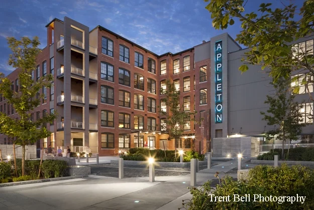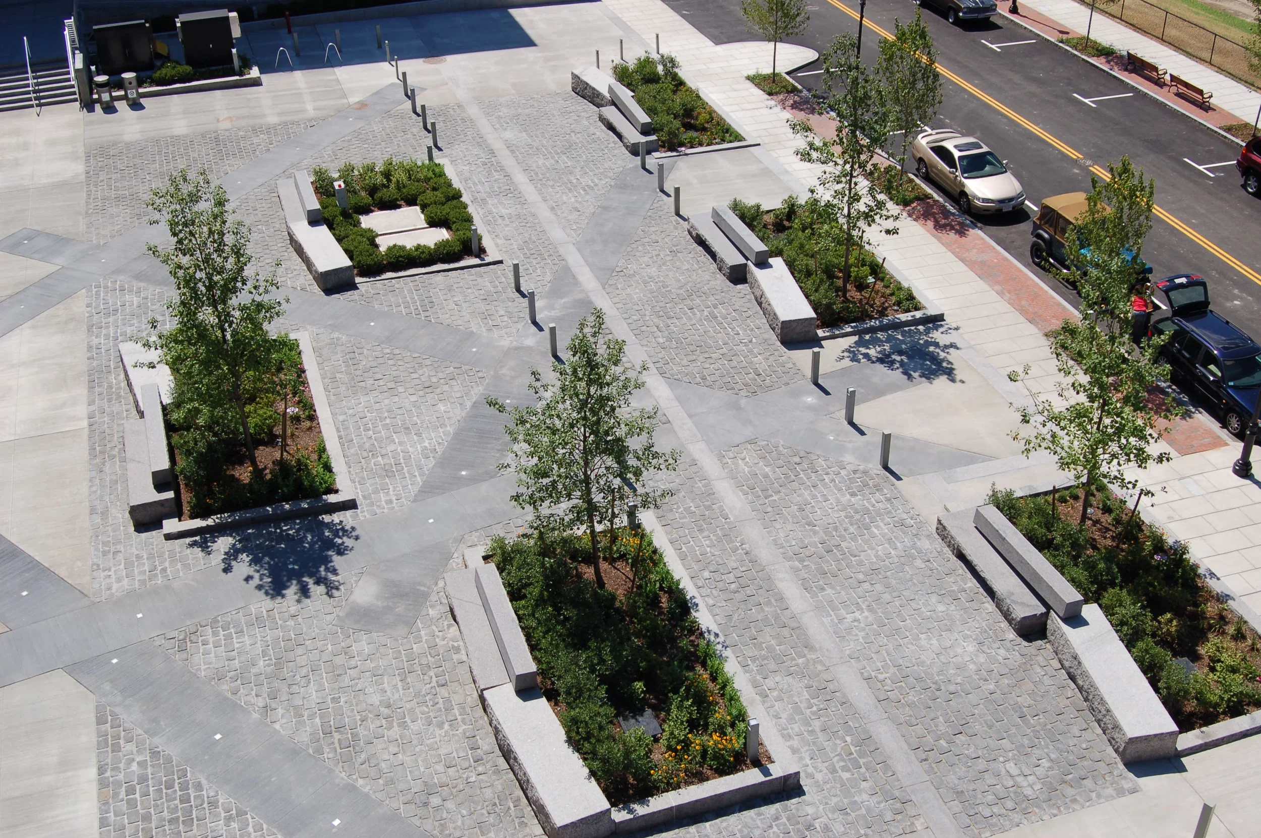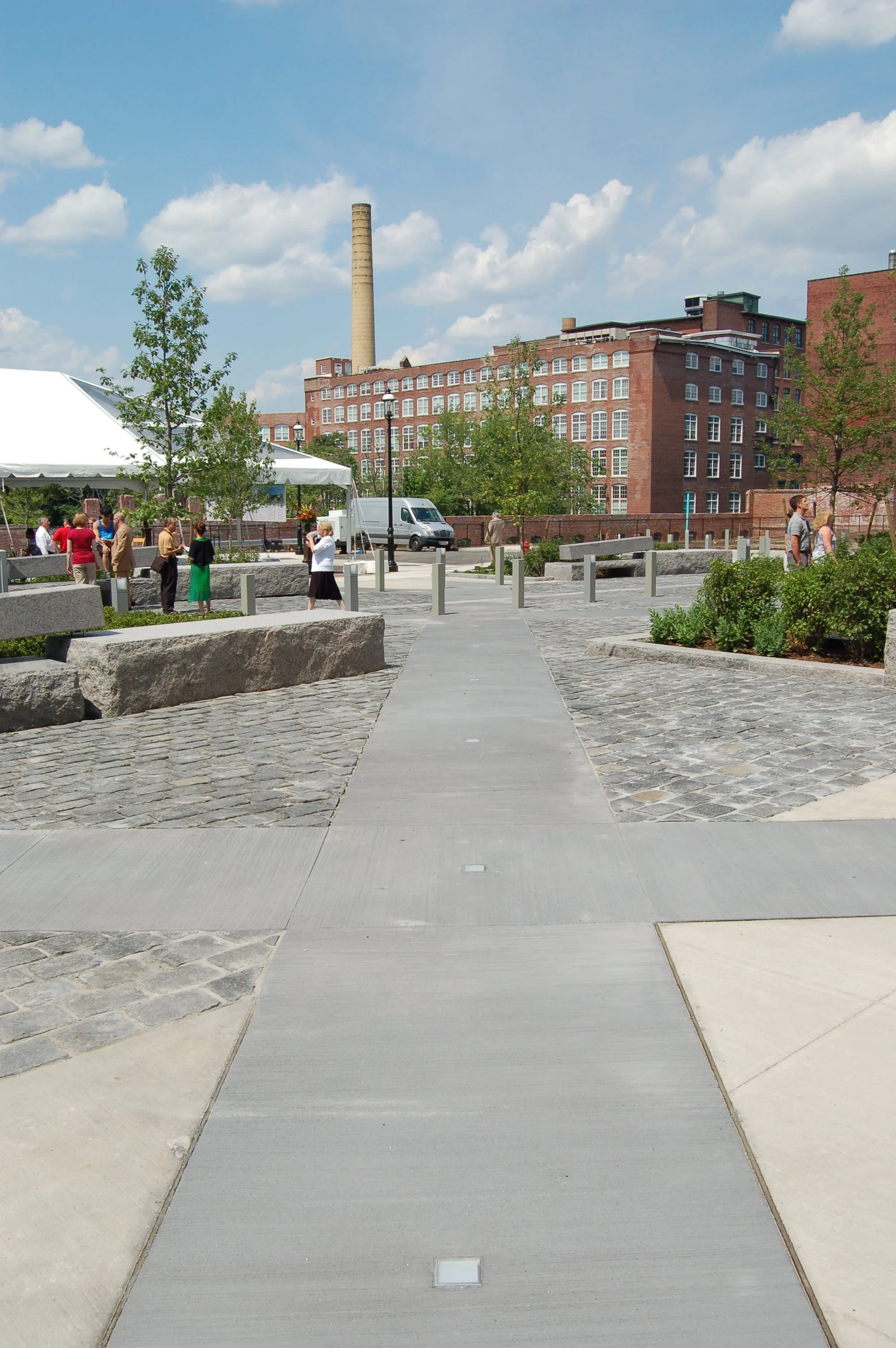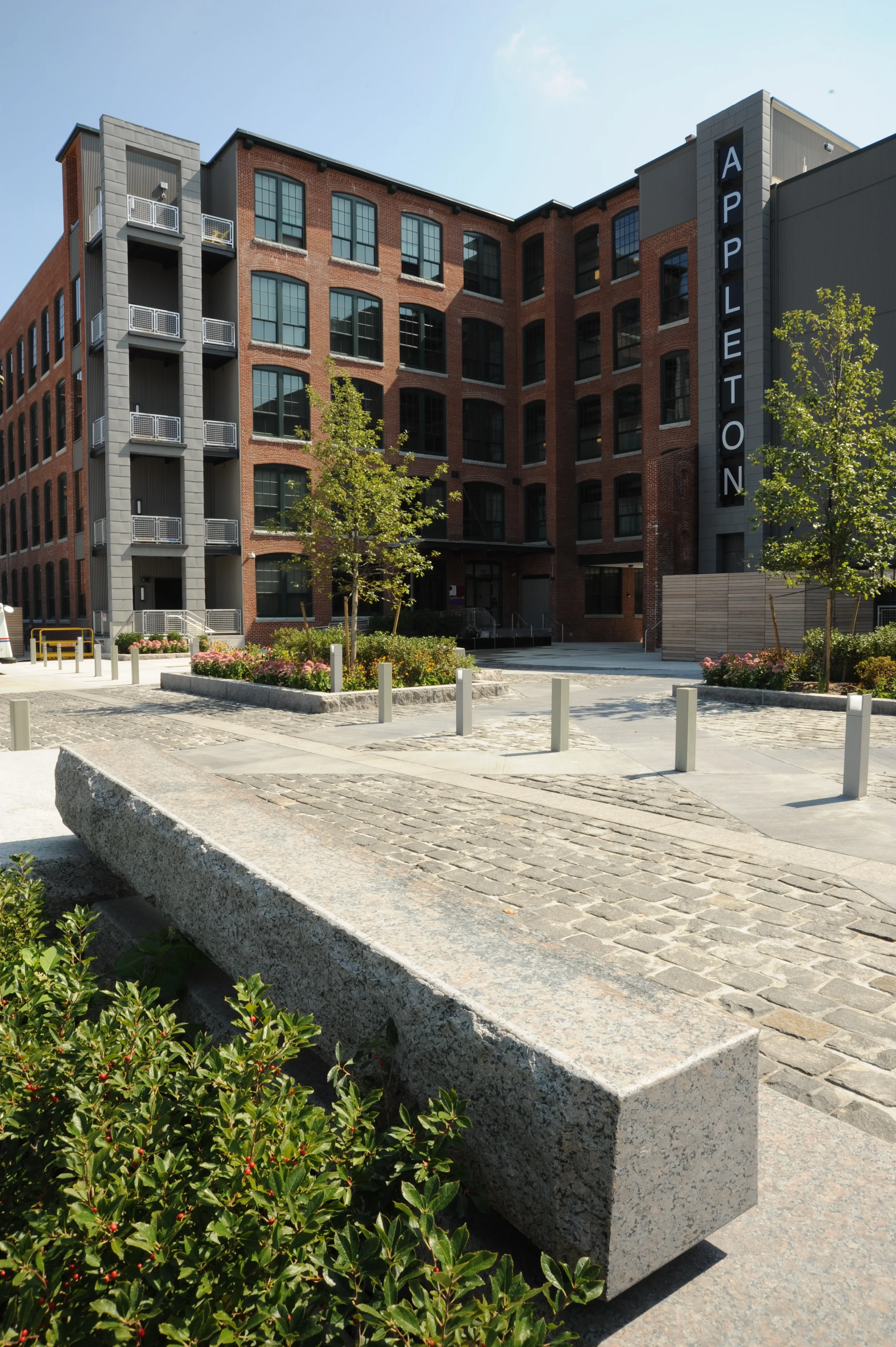 The historic Appleton Mill and Freudenberg buildings in Lowell’s Hamilton Canal District were meticulously rehabilitated from long-vacant industrial structures into vibrant live/work studios and gallery spaces that anchor this mixed-use, waterfront neighborhood and support the city’s creative economy and urban revitalization goals. The landscape design of the mill yard honors the site’s 19th-century waterpower heritage, incorporating rain gardens framed by stacked block seatwalls that evoke the original canal walls and a lighted fountain aligned with the former penstock routes that once carried water to power mill turbines, reinforcing the narrative of water as the district’s historic lifeblood while marking a gateway across the canal. These improvements, paired with restored walkways that trace historic worker paths and public spaces that connect to the broader Hamilton Canal Innovation District, reflect a balance of adaptive reuse, sustainable site strategies, and interpretive design that celebrates both industrial legacy and contemporary urban life.