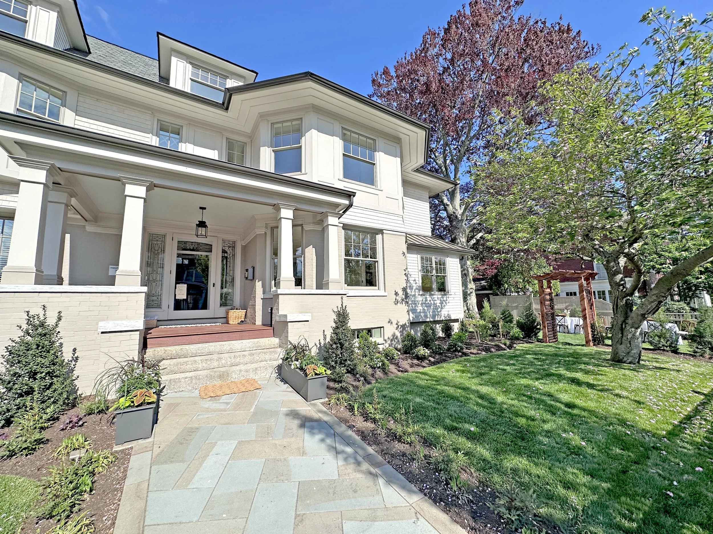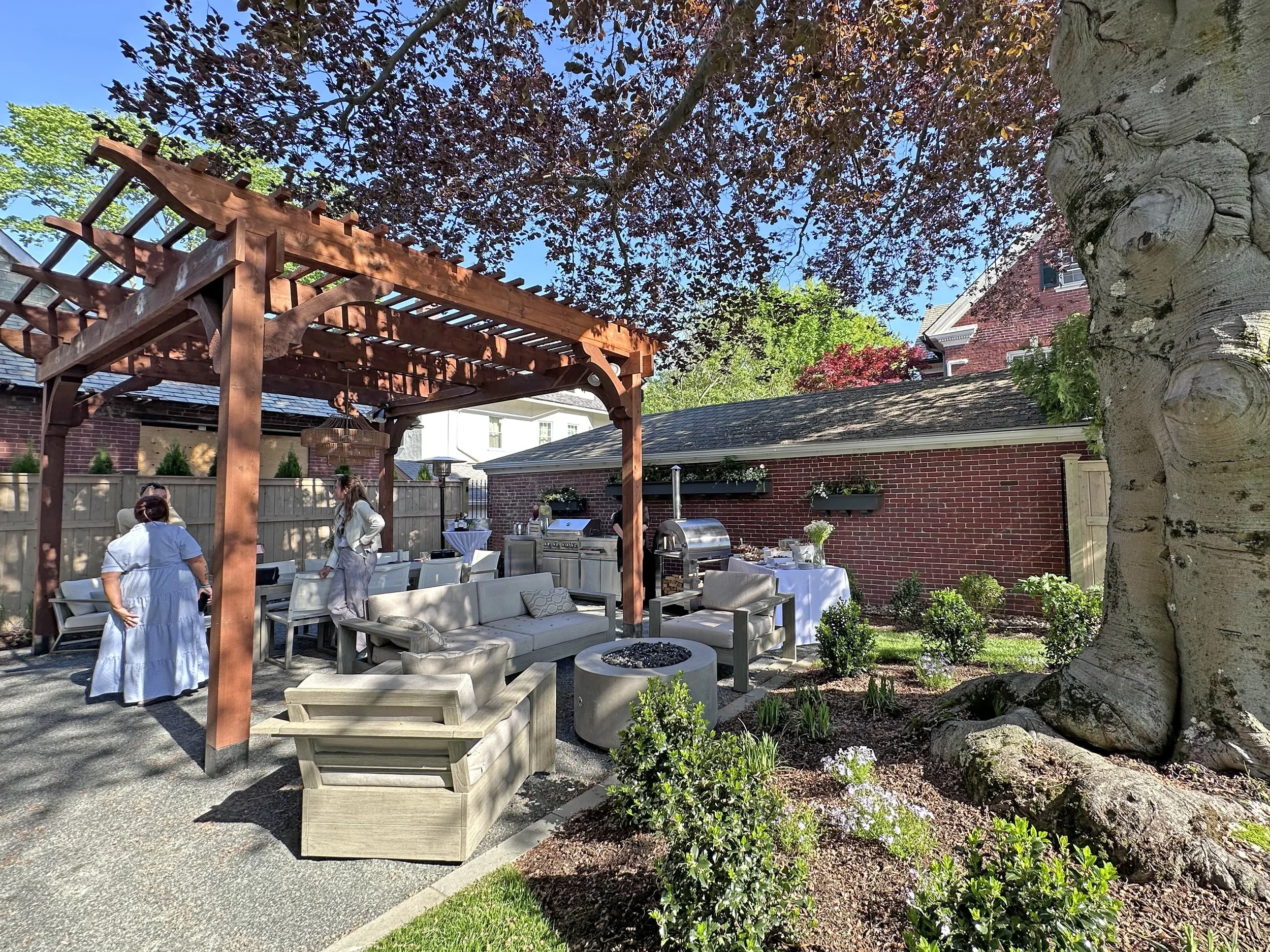 The design for Hanley House extends the home’s thoughtful renovation into the outdoors, creating refined yet welcoming space for gathering, reflection, and everyday enjoyment. The reimagined landscape unfolds as a lush, immersive setting anchored by a custom gas fire pit, a tranquil water feature, and an impressive cedar pergola that defines the primary outdoor living area. Together, these elements establish a warm and inviting atmosphere for entertaining, from intimate evenings to larger celebrations. Layered plantings soften architectural edges and provide seasonal interest, while carefully curated materials and detailing reinforce a sense of craftsmanship and permanence. Designed to balance social connection with restorative calm, the landscape seamlessly integrates beauty, function, and comfort—transforming the outdoor spaces into an extension of the home and a backdrop for unforgettable gatherings.